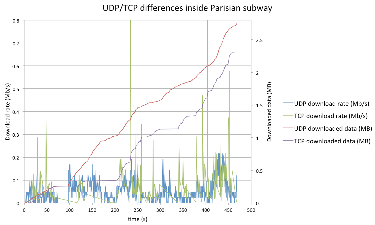 Thus we were able, with two identical iPhones, over the same cellular operator network, to make several measurements inside the Parisian subway, and then compare both protocol behaviors.