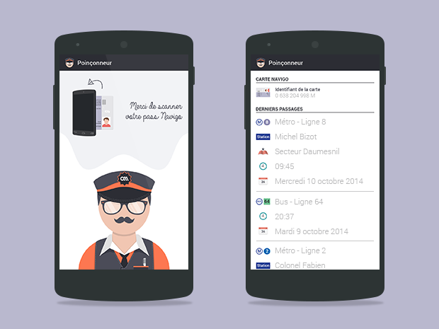 Suite à ces découvertes, nous avons réalisé un démonstrateur sous la forme d’une application Android baptisée Poinçonneur. Elle permet à l’utilisateur de voir le contenu de toute carte Navigo à proximité du téléphone. Pour ce faire, il suffit de mettre une carte Navigo contre le téléphone pour qu’elle soit détectée et analysée. L’application affiche alors, pour chacune des trois dernières utilisations de la carte, la date, l’heure, le mode de transport (métro, bus, tram…), la ligne et la station (uniquement pour le métro et le bus) correspondants. Il est intéressant de noter que toutes ces informations sont lisibles en clair sur les cartes Navigo, seule une table de correspondance pour les stations de métro étant utilisée dans l’application.
